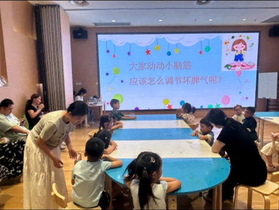 為增強參與感,團隊設(shè)置“大家動動腦,調(diào)節(jié)壞脾氣”互動環(huán)節(jié)。志愿者走到孩子中間,引導(dǎo)他們結(jié)合生活實際思考情緒調(diào)節(jié)妙招。“我生氣了會深呼吸!”“我會找媽媽抱一抱!”孩子們稚嫩的回答充滿童真,現(xiàn)場氛圍熱烈。
