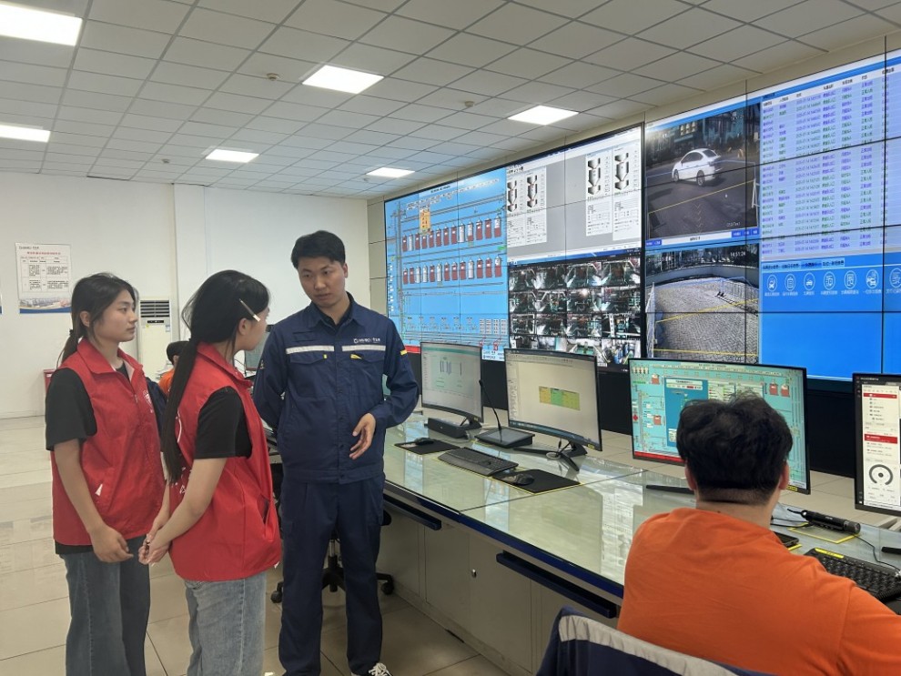 技術(shù)人員為團(tuán)隊成員介紹港口綠色降碳設(shè)施的運行機(jī)理。許董紫瑩攝