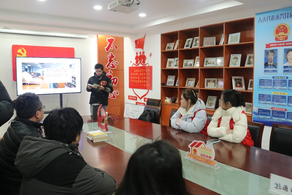 社區(qū)會(huì)議室里,一場(chǎng)讀書(shū)分享會(huì)正進(jìn)行:青年志愿者手持書(shū)籍講述,分享“兩彈一星”精神。墻面“不忘初心”標(biāo)語(yǔ)、書(shū)架上的榮譽(yù)相框,襯著紅馬甲志愿者的身影,讓這場(chǎng)分享浸著暖意與朝氣。