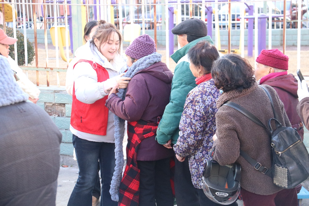 為老人送上提前編織好的圍巾,協(xié)助試戴,表達(dá)青年志愿者們關(guān)心。并且志愿者們將提前寫(xiě)好的祝?ㄆ煌(zèng)送給老人,為老人朗讀祝福語(yǔ)。與老人親切交流,了解其生活近況與需求,給予情感陪伴。他們細(xì)心地將圍巾披在老人肩頭,輕輕繞上脖頸,再仔細(xì)掖好邊角。老人們摩挲著柔軟的圍巾,眉眼間笑意舒展,鬢角的白發(fā)在風(fēng)里輕輕飄動(dòng)。
