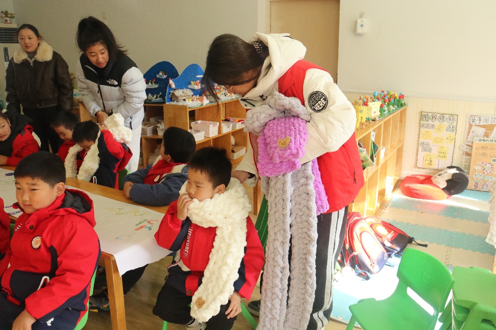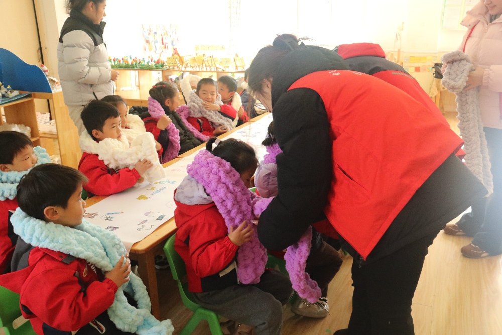 送給幼兒軟軟的圍巾,并希望他們把這份溫暖也分享給身邊的小伙伴,大家一起暖洋洋!