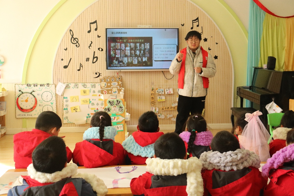 志愿者通過圖片、視頻等資料,介紹“兩彈一星”的發(fā)展背景、關鍵人物和重要成果。以幼兒通俗易懂能理解的方式,向他們講解“熱愛祖國、無私奉獻、艱苦奮斗、團結協作、勇于登攀”的科學家精神。
