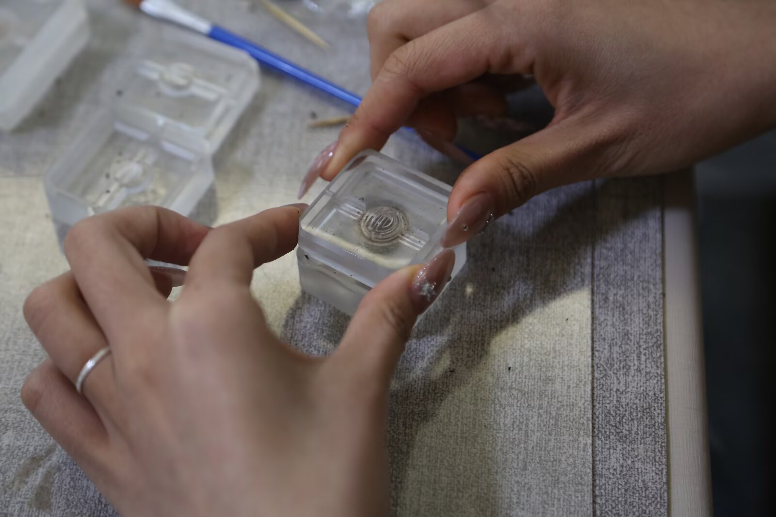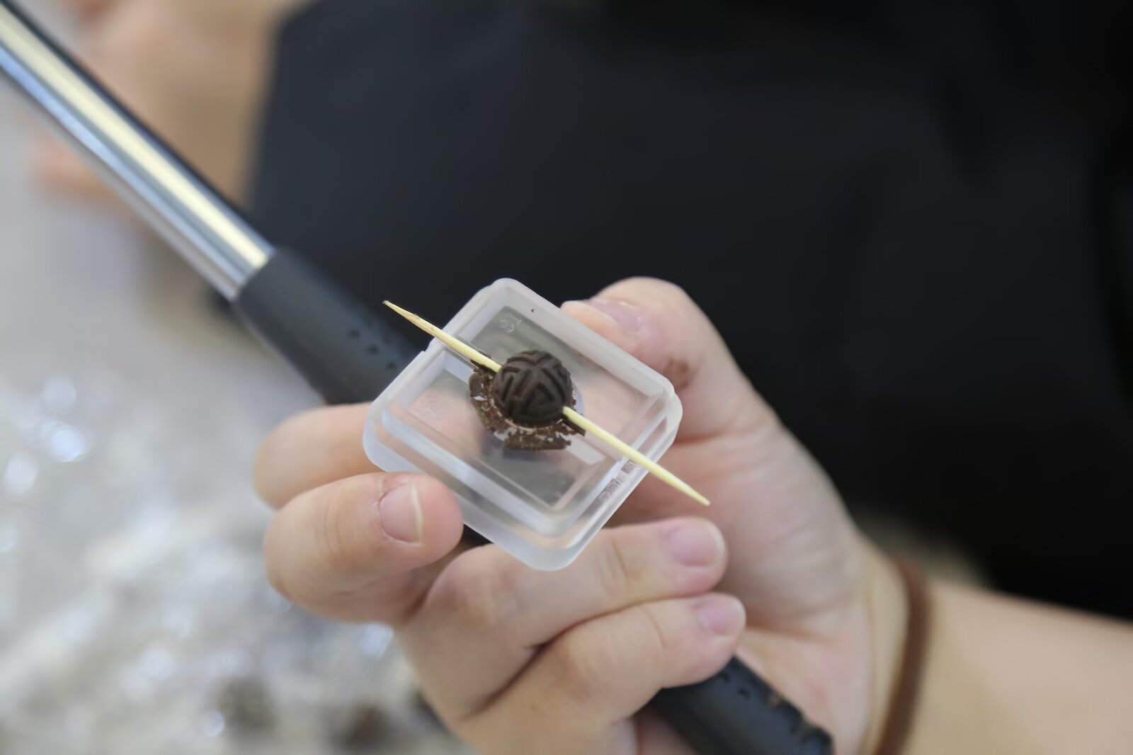 進(jìn)入手工制作環(huán)節(jié),同學(xué)們結(jié)合課堂上學(xué)到的食品膠體特性與配方優(yōu)化知識(shí),嘗試調(diào)整香泥的濕度與韌性直至香粉形成“干濕均勻的絮狀團(tuán)”(無(wú)干粉、不滴水)。隨后,將絮狀香粉轉(zhuǎn)移至硅膠墊進(jìn)行揉合,在揉泥過(guò)程中,不少同學(xué)發(fā)現(xiàn)這與食品加工中面團(tuán)揉制的面筋形成原理高度相似,于是借鑒揉面手法,讓香泥更加細(xì)膩均勻,像揉面一樣持續(xù)10-15分鐘,直至香泥表面光滑、不粘手、有韌性(揉捻不到位會(huì)導(dǎo)致珠體開裂)。接著將揉好的香泥放入密封盒,常溫靜置20分鐘(醒香),讓純露充分滲透香粉,使香泥質(zhì)地更細(xì)膩,香氣更柔和。醒香結(jié)束后,大家一邊搓揉香泥、壓制成型,一邊交流創(chuàng)意,有的在香珠表面雕刻紋路,有的嘗試混合不同香料探索新香氣,現(xiàn)場(chǎng)充滿了青春的創(chuàng)意與熱情。