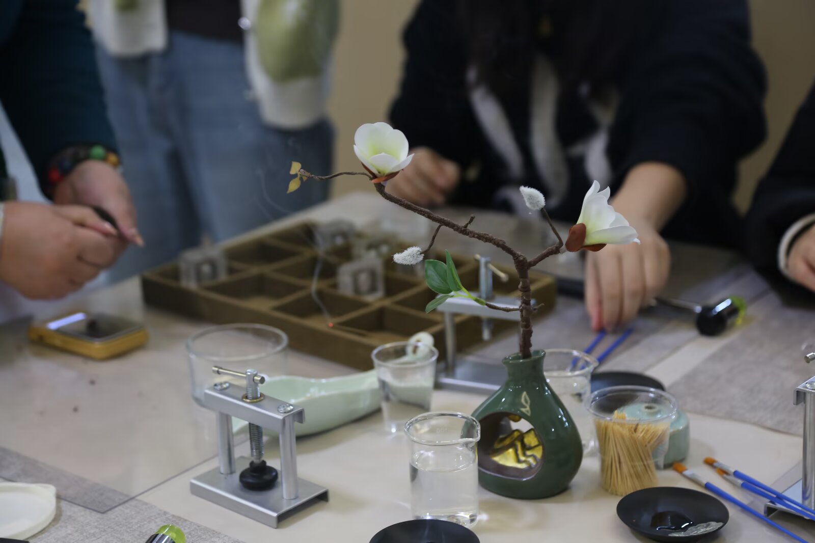 在文化講解后,鄭老師轉(zhuǎn)向合香珠的制作技藝教學(xué)。她詳細(xì)拆解了合香珠的完整工序:從沉香、檀香、龍涎香等香料的精準(zhǔn)配比,到用蜜、水、粘粉調(diào)和成香泥的“醒泥”技巧;從揉泥排氣的力度控制,到壓模成型、穿孔打磨的細(xì)節(jié)要點(diǎn)。鄭老師強(qiáng)調(diào),合香珠的陰干過(guò)程需要在通風(fēng)避光處?kù)o置7-15天,期間不能觸碰或移動(dòng),這正是傳統(tǒng)非遺“慢工出細(xì)活”的匠心體現(xiàn)。