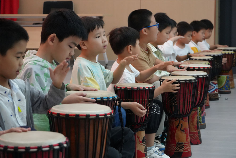 孩子們在學(xué)中玩,在玩中學(xué),將對藝術(shù)的興趣寄托在每一節(jié)課的知識點(diǎn)中。他們臉上洋溢著燦爛的笑容,懵懂的表情是對新奇事物——非洲鼓的探索,也是自身素養(yǎng)提升的過程。在非洲,非洲鼓具有很強(qiáng)的社交功能,人們圍坐在一起,共同演奏和跳舞,增進(jìn)了彼此之間的友誼和團(tuán)結(jié)。