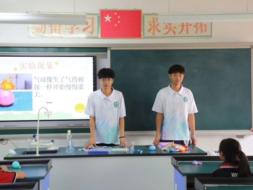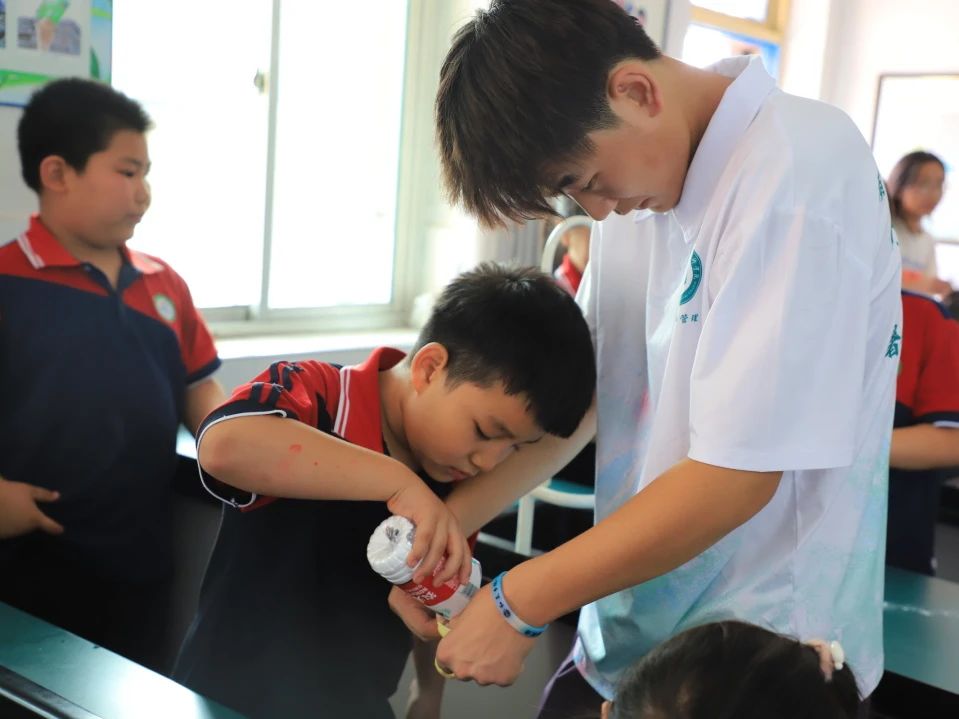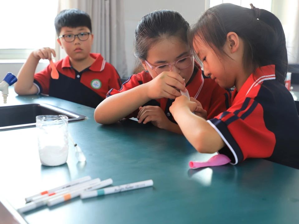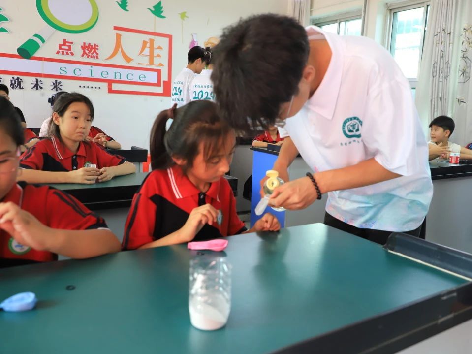 實(shí)驗(yàn)求創(chuàng)新,科普助成長(zhǎng)。“小老師”朱昭宇、劉梁、趙啟恩將所學(xué)物理化學(xué)知識(shí)與日常生活相結(jié)合,精心設(shè)計(jì)了“生氣的河豚”、“吹不破的泡泡”等有趣的科學(xué)小實(shí)驗(yàn),帶領(lǐng)小朋友們一同動(dòng)手操作,觀察實(shí)驗(yàn)現(xiàn)象,積極思考,通過實(shí)驗(yàn)探索真知,用科學(xué)點(diǎn)亮未來。