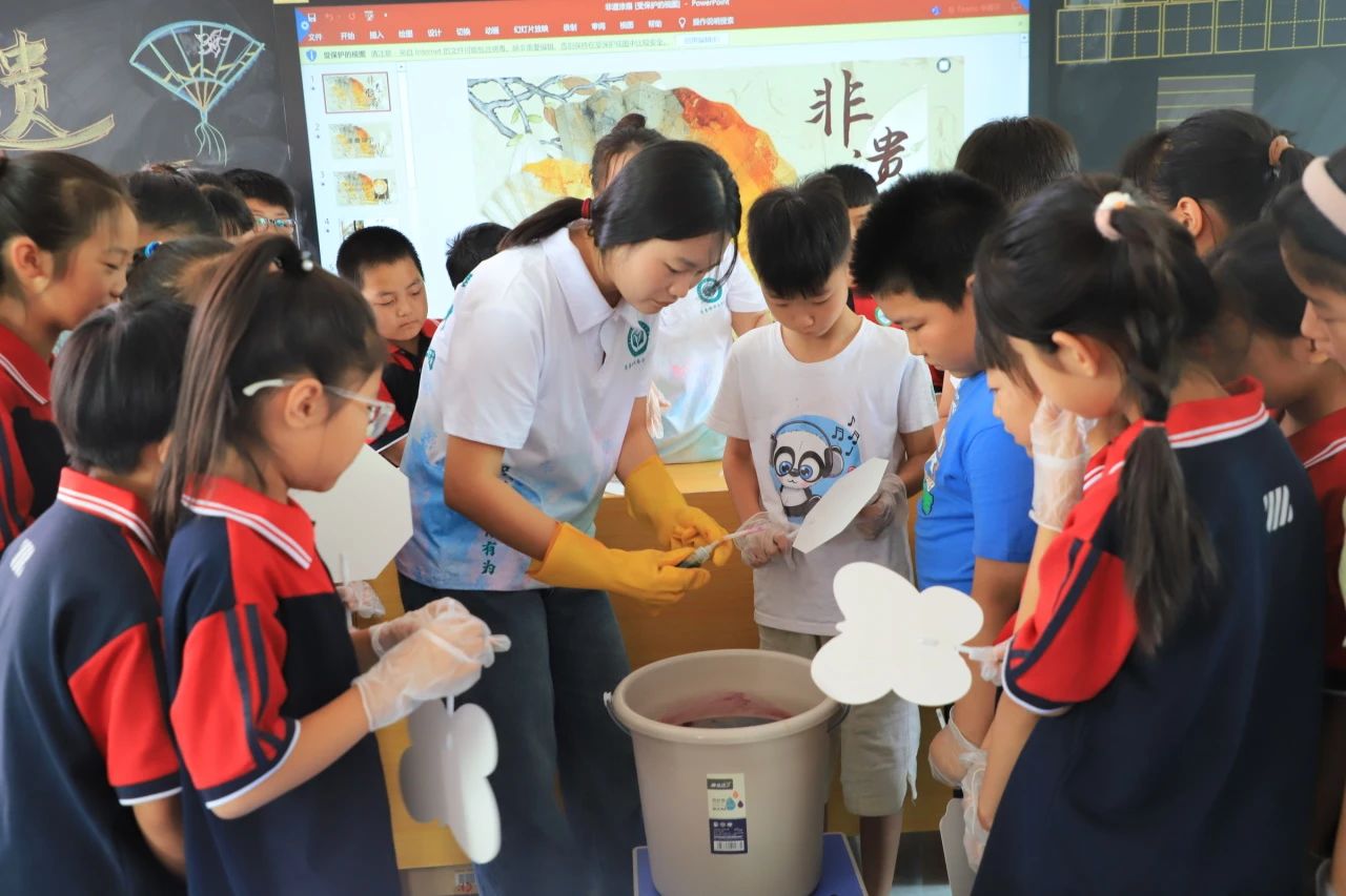 以漆為筆,以水為墨。一進(jìn)一出間,東方絕美色彩便在“扇”上翩翩起舞。“小老師”樊聰聰、尹朝寧、曹梓涵、趙啟恩從漆扇的歷史、制作方法和漆扇傳承的意義出發(fā),生動(dòng)形象地向小朋友們介紹了這一非物質(zhì)文化遺產(chǎn),隨后大家一同體驗(yàn)了漆扇的制作,選取顏色、滴漆、攪拌、上漆、晾干、裝飾,最終小朋友們做出了屬于自己獨(dú)一無二的漆扇。