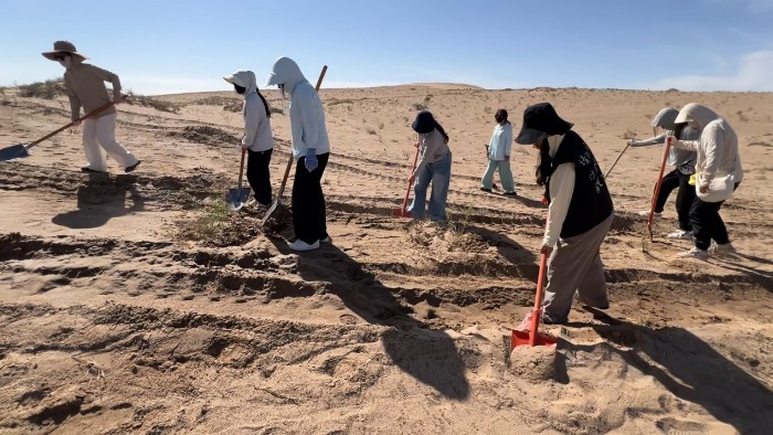 圖為長安大學赴甘肅民勤“‘青’走治沙路,共架生態(tài)‘橋’”暑期實踐隊重填土壤。周子弦 供圖