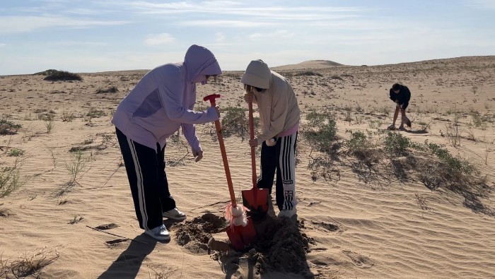 圖為長安大學赴甘肅民勤“‘青’走治沙路,共架生態(tài)‘橋’”暑期實踐隊進入沙漠為梭梭樹挖儲水的坑洞。錢思雨供圖