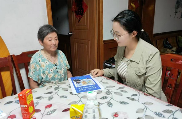 。ㄇ嘈闹䦃(mèng)宣講團(tuán)隊(duì)員張顏正在為居民解讀反詐政策)
