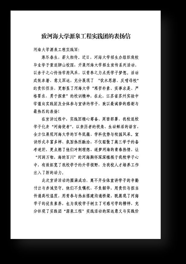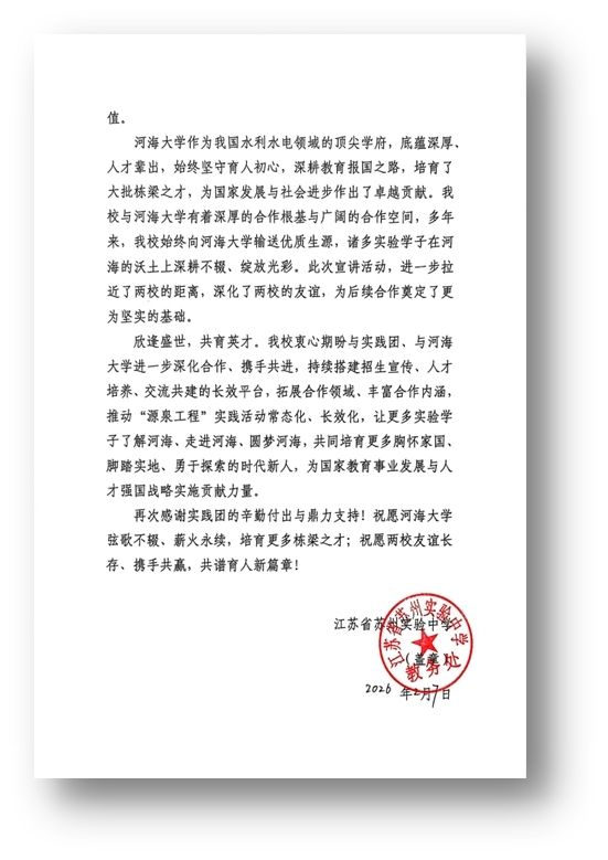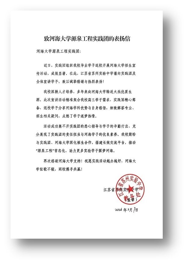 此次 “源泉工程” 實踐活動的圓滿開展,得到了江蘇省蘇州實驗中學的高度認可與贊揚,學校專門為實踐團發(fā)來表揚信,對河海大學學子的責任擔當與優(yōu)良素養(yǎng)給予充分肯定。信中提到,此次宣講活動精準契合高三學子的升學需求,返校學子化身 “河海使者”,全方位展現(xiàn)了河海大學的辦學實力與校園風采,不僅驅(qū)散了學子們的備考迷茫,更點燃了他們逐夢河海的青春熱情,為蘇實學子拓寬了升學視野,為學校人才培養(yǎng)注入了新動力。圖5:實驗中學各校區(qū)對實踐團致表揚信