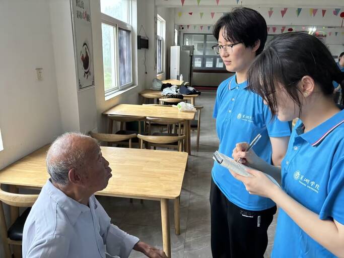 到達敬老院后,團隊成員對敬老院負責人管翠紅院長和爺爺奶奶進行了采訪,具體了解敬老院的日常助老服務以及老人們的生活起居狀態(tài)。在與管院長的深入交談中,團隊了解到,周邊地區(qū)的社工會定期開展節(jié)目表演、端午節(jié)包粽子等特色活動來慰問老人。當?shù)蒯t(yī)院也會定期進行體檢等相關(guān)義診服務,如遇緊急情況,能確保第一時間提供救助服務,保障老人們的健康。敬老院還成立了餐飲委員會,嚴格制定并公示每周菜譜,根據(jù)老人們的反饋意見進行調(diào)整。團隊成員侯停停采訪了李爺爺,李爺爺表示自己在敬老院已經(jīng)十年了,對這里的助老服務非常滿意,也非常歡迎大學生志愿者的到來。
