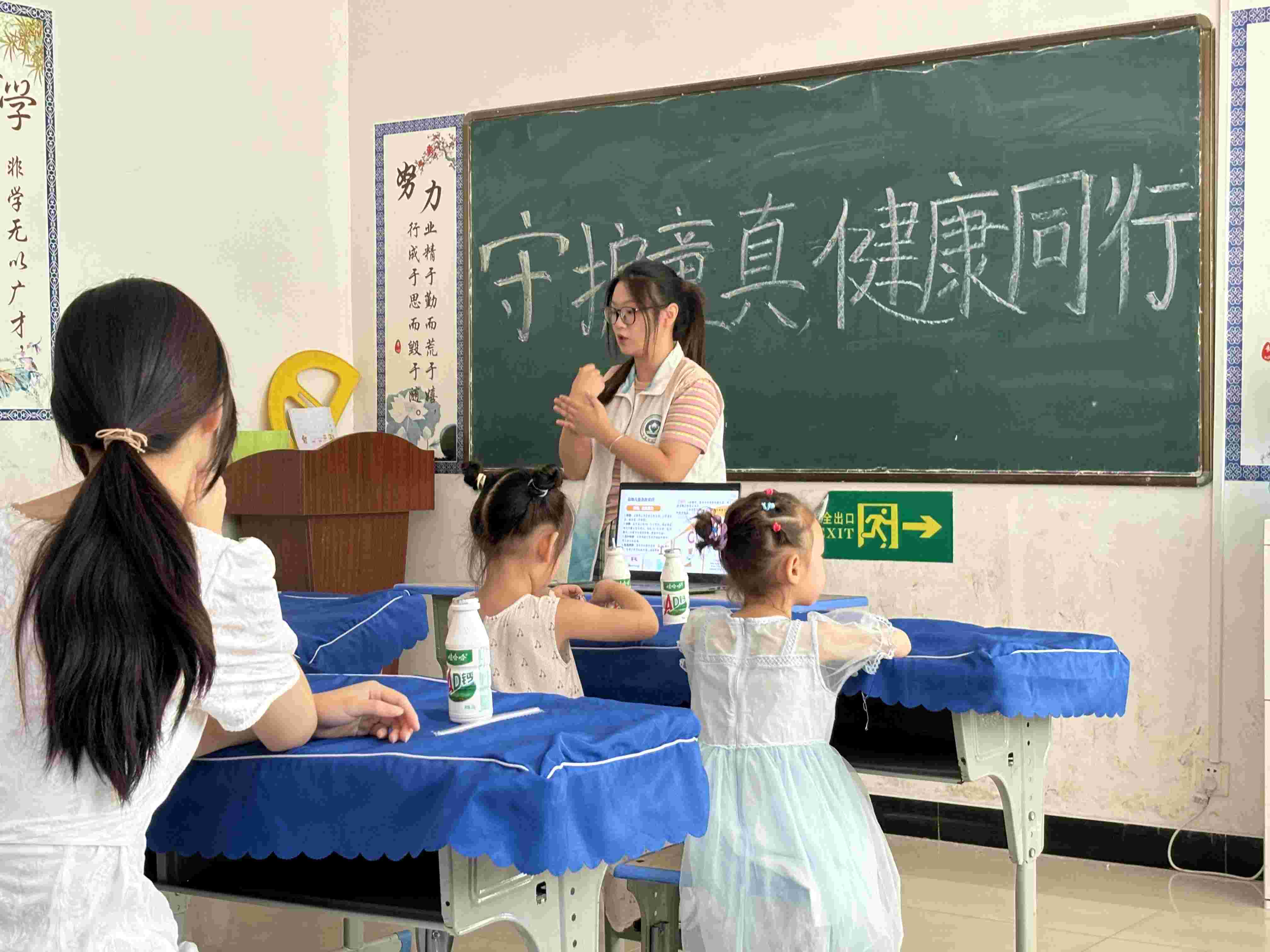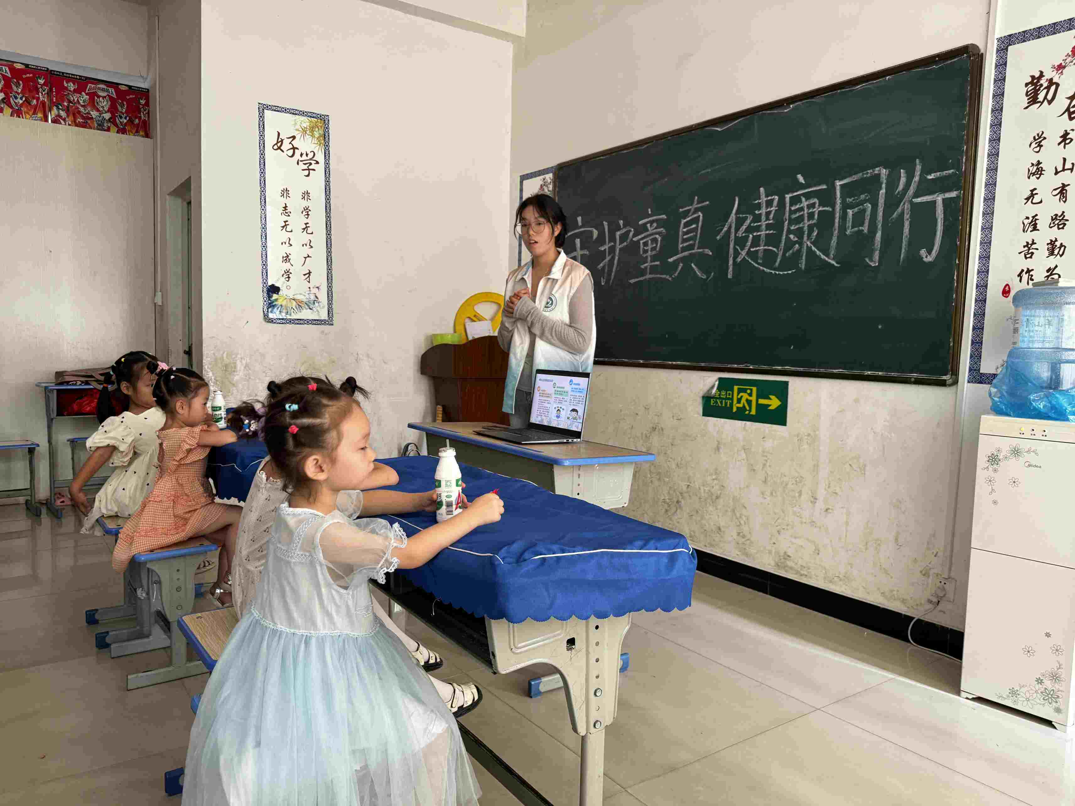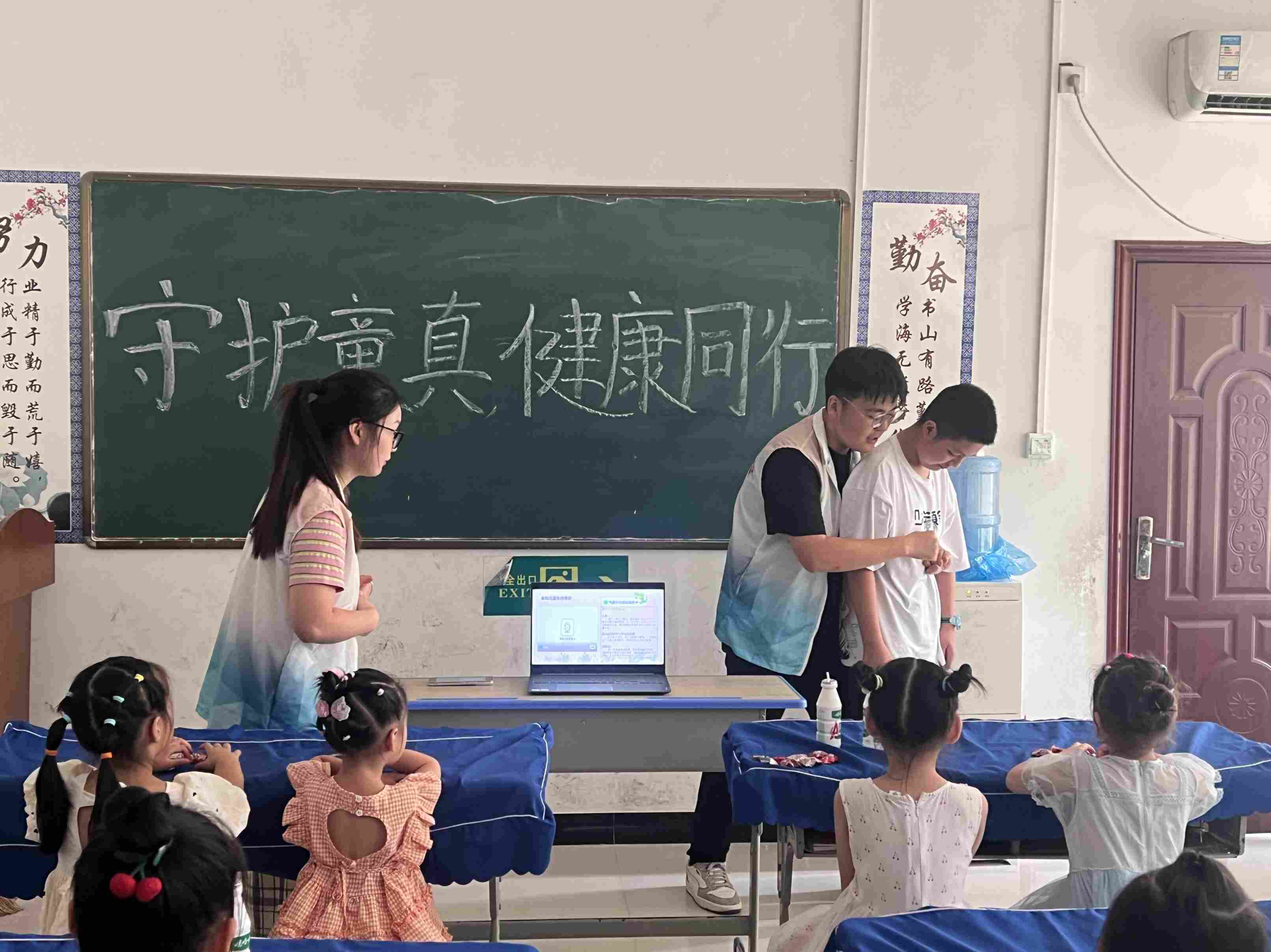 首先由實踐隊員給小朋友們進行話題引入,消除了小朋友們在陌生環(huán)境下的焦慮并調(diào)動了小朋友們的課堂參與積極性。隊員們的課堂分為四個部分。第一部分是由路雅婷同學(xué)為小朋友們帶來的“暑期兒童疾病防控常識”,詳細闡述了中暑、呼吸道疾病、腸道疾病、皮膚疾病以及溺水的預(yù)防注意事項以及預(yù)防措施,在課堂上,小朋友們被實踐隊員的講解吸引,不知不覺都參與到了課堂中。