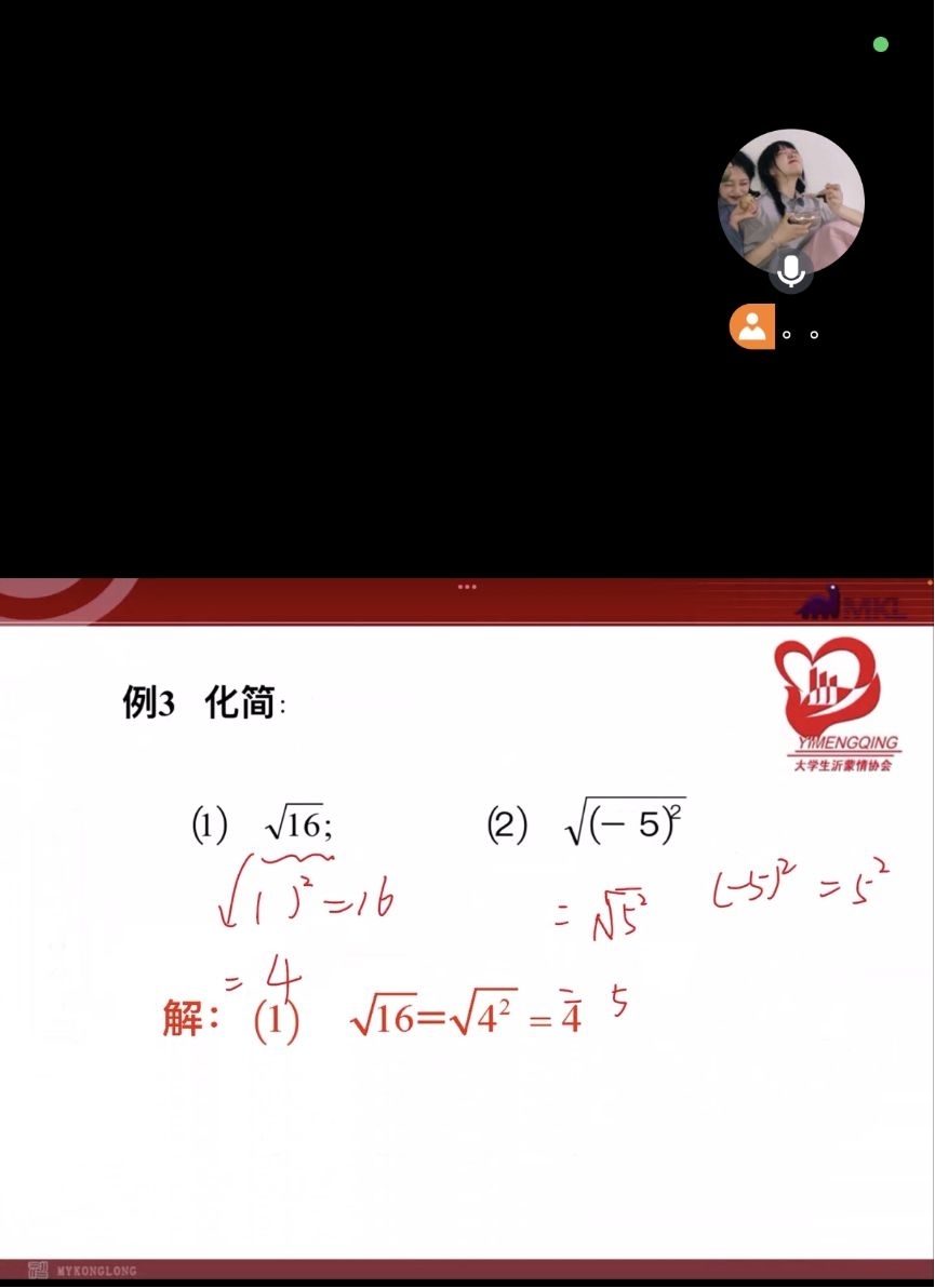 在數(shù)學教學上,志愿者正在講解“根號的化簡”這一知識點?紤]到線上教學的特點,志愿者提前準備了多道同類型題目,以便學生進行對知識點的鞏固提升。她耐心講解每一道題目,引導學生將根號一步步進行化簡,讓抽象的數(shù)學知識變得更加易懂。