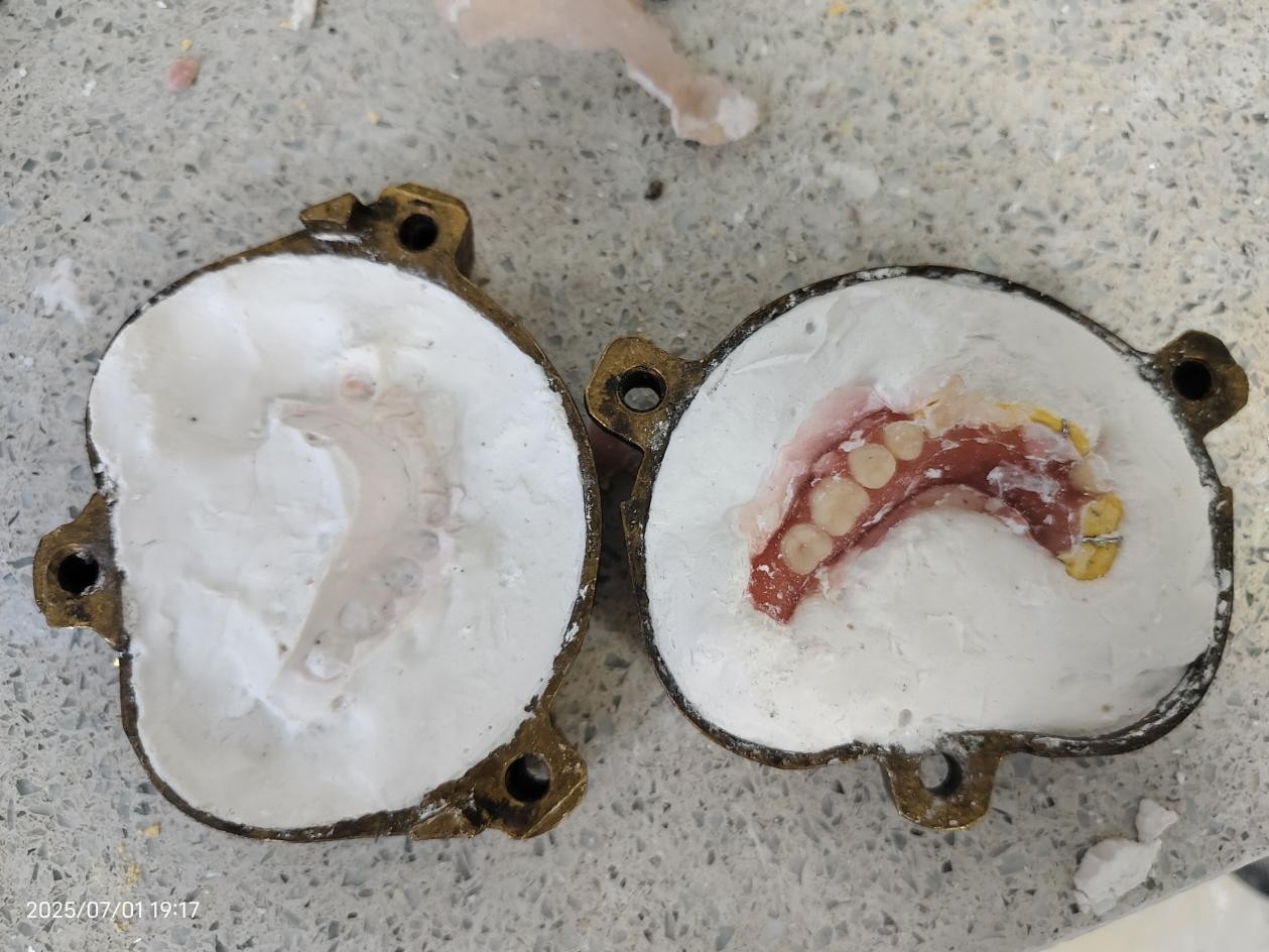 午后,老師們帶領(lǐng)同學(xué)們轉(zhuǎn)入蠟型修整環(huán)節(jié),看似簡(jiǎn)單的步驟背后,藏著對(duì)精確程度的極致追求。老師們一邊操作,一邊向同學(xué)們講解著每個(gè)流程的原理與要點(diǎn),從裝盒填充石膏的手法,到熱處理去臘時(shí)的溫度把控,再到二次涂布分離劑、填膠的時(shí)機(jī)選擇,以及最終的打磨拋光,一一進(jìn)行拆解演示。同學(xué)們圍在工作臺(tái)旁,通過(guò)觀察老師的操作細(xì)節(jié),并親自實(shí)操后,在“學(xué)中做、做中學(xué)”的互動(dòng)中領(lǐng)悟義齒制作“差之毫厘,謬以千里”的嚴(yán)謹(jǐn)。經(jīng)過(guò)一整天的協(xié)作配合,一副副義齒終于制作完成。