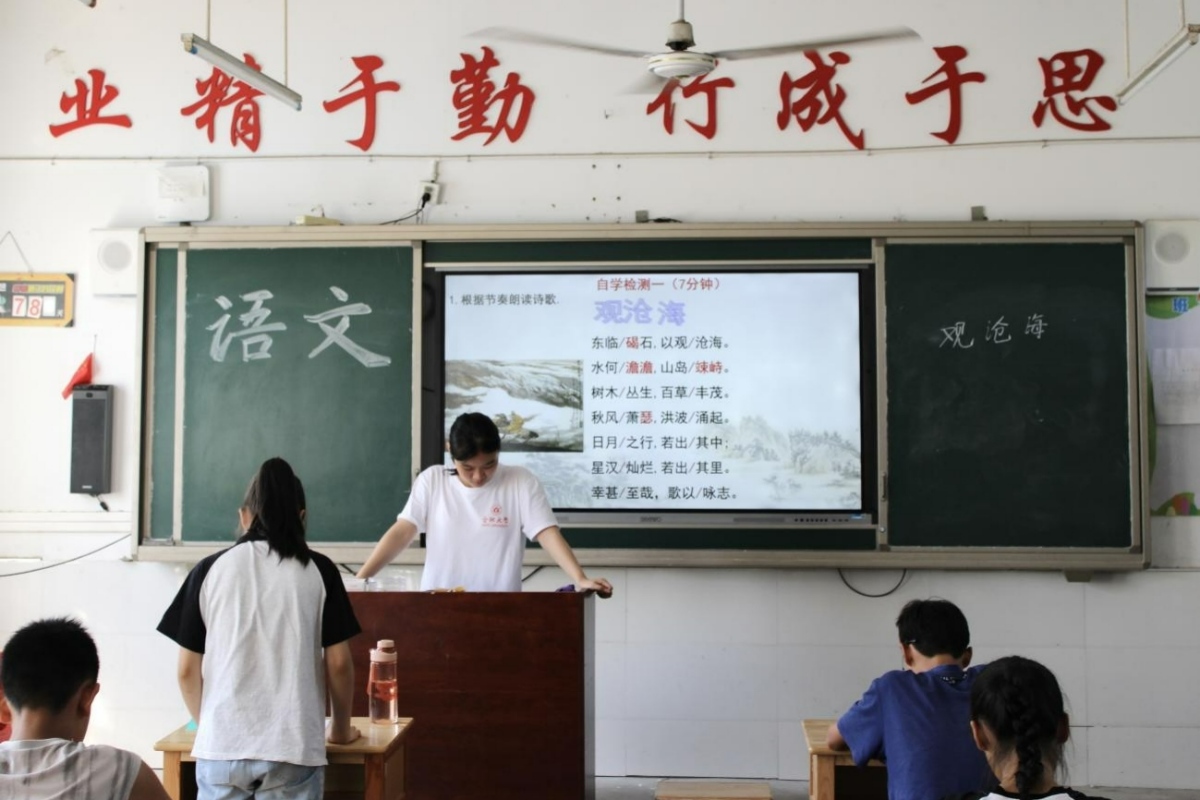 招生宣講完畢后,教學組相繼開啟趣味課堂。繪畫涂色課充滿童趣與創(chuàng)想。英語課互動教學激發(fā)孩子們的學習熱情。語文課讓學生感受詩詞雄渾意境。這些趣味課堂,以多元形式拓寬鄉(xiāng)村孩子知識視野,在激發(fā)學習興趣的同時,借文化課程厚植人文底蘊,用青春力量為鄉(xiāng)村教育添彩,助力文化傳承與振興 。