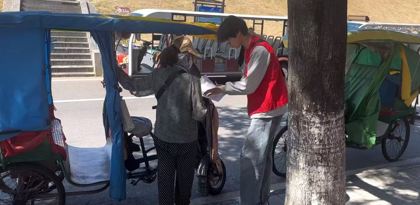 圖為團(tuán)隊(duì)成員分發(fā)調(diào)查問卷與交談(攝影:汪驍涵)