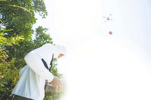 圖二為當(dāng)?shù)仫w手正在操控?zé)o人機(jī)采收橙子