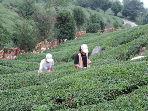 (圖為小橙故事實(shí)踐隊(duì)隊(duì)員體驗(yàn)采摘茶葉)