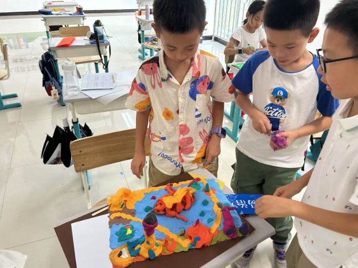 講解介紹結(jié)束后,孩子們將自己的所見(jiàn)所感濃縮到指尖粘土的揉捏塑造中,讓腦海中的小宇宙變得可觸摸可感。表面凹凸不平的月球、造型奇特的船、蜿蜒崎嶇的山……孩子們將現(xiàn)實(shí)與想象相結(jié)合,用粘土、干花材料構(gòu)建出充滿奇幻色彩的想象空間,充分發(fā)揮主觀能動(dòng)性,展現(xiàn)自我內(nèi)心的獨(dú)特色彩,也加深了對(duì)現(xiàn)實(shí)世界的理解。