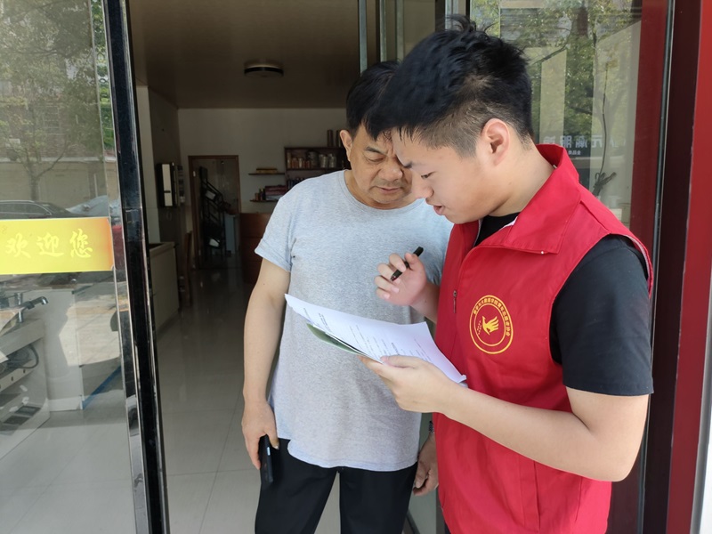 抵達(dá)同大鎮(zhèn)后,團(tuán)隊(duì)成員迅速分組行動(dòng),帶著提前設(shè)計(jì)好的調(diào)查問卷,走向鎮(zhèn)內(nèi)的集市、居民區(qū)和沿街商戶。無論是正在擺攤的商販,還是乘涼閑聊的居民,隊(duì)員們都主動(dòng)上前,用熱情的招呼和耐心的引導(dǎo),邀請(qǐng)大家參與問卷填寫。過程中,他們始終保持親和態(tài)度,遇到年長或視力不佳的居民,便逐題輕聲念讀,協(xié)助完成作答,讓每份問卷都承載著真實(shí)的想法與需求。