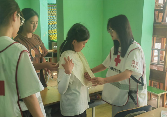針對青少年常見意外傷害場景,實踐團成員通過“理論+實踐”的模式,采用情景模擬、互動問答等生動形式,向孩子們講解擦傷處理、碰撞傷急救、中暑預防等實用知識。課程摒棄艱澀術語,以情境動畫貫穿始終,依次拆解發(fā)燒、擦傷、碰撞傷、流鼻血、中暑幾種暑期高發(fā)意外的識別與處置要點。每講一個知識點,志愿者便引導孩子們用“小手勢操”復述關鍵步驟——“一看、二喊、三撥120”,朗朗上口的口訣讓急救流程秒變“順口溜”。在實操環(huán)節(jié),隊員們手把手指導小學員們練習環(huán)形包扎法、手心傷口8字包扎法、三角巾大懸臂帶包扎法等基礎急救技術,通過分組競賽等方式激發(fā)孩子們的學習興趣,以此活動向孩子們傳遞急救知識,提高孩子們對“人人學急救,急救為人人”及紅十字“保護生命與健康”理念的理解。