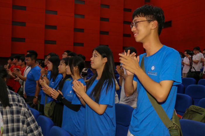 學習了井岡山精神的深刻內(nèi)涵之后,同學們(著藍色隊服)起立鼓掌。王智杰 攝