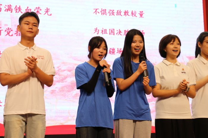 安理工實踐團隊隊員(著藍色隊服)演唱紅歌《強軍戰(zhàn)歌》。王智杰 攝
