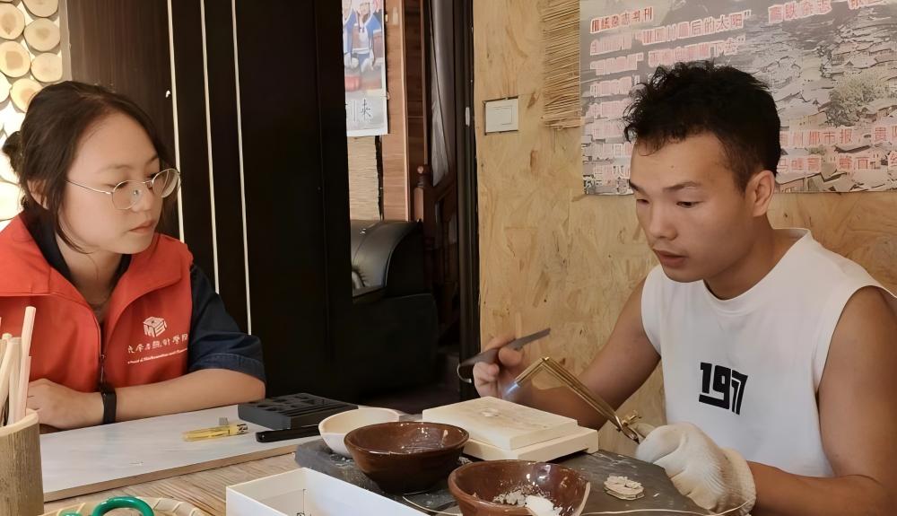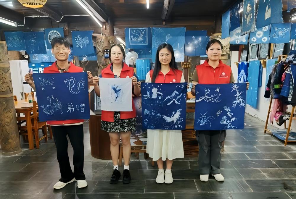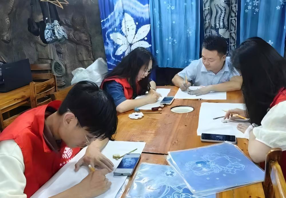 在嘎歌古巷,團(tuán)隊(duì)成員學(xué)習(xí)并體驗(yàn)了苗族銀飾的鍛造工藝和苗族蠟染工藝。非遺傳承人龍虎太的學(xué)徒阿青指導(dǎo)隊(duì)員學(xué)習(xí)敲打銀片、焊接銀飾。在苗族非遺蠟染體驗(yàn)中心,負(fù)責(zé)人龍老師和侯老師指導(dǎo)每位隊(duì)員進(jìn)行鉛筆繪圖、蠟刀上蠟、浸水染色、平鋪氧化、煮沸脫蠟、清洗晾干等工作,完成了一套完整的蠟染流程。隊(duì)員們都獲得了一副屬于自己的蠟染作品。