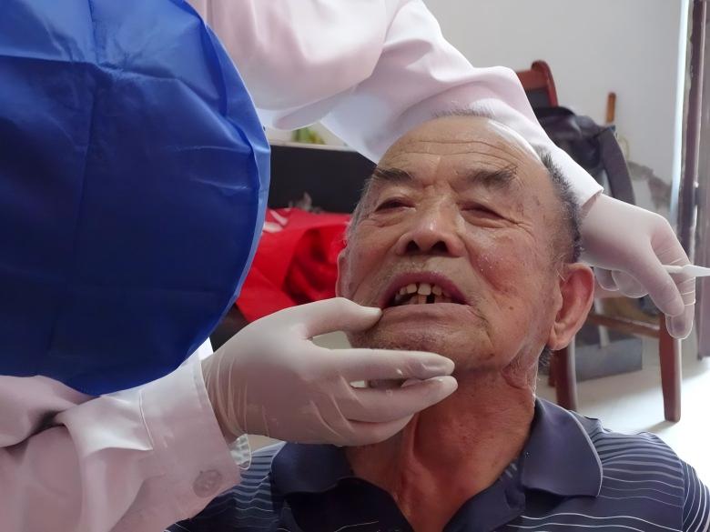 五位老人陸陸續(xù)續(xù)來到志愿者服務(wù)點,三位醫(yī)生仔細(xì)檢查每位老人的口腔現(xiàn)狀并進(jìn)行義齒的佩戴,志愿者們則在一旁協(xié)助傳遞工具、記錄老人反饋。在佩戴過程中,醫(yī)生需要不停地詢問老人是否有疼痛、擁擠等不良現(xiàn)象,并根據(jù)老人的回復(fù)對義齒進(jìn)行細(xì)致調(diào)整——或使用手機(jī)打磨義齒,或使用印紙反復(fù)校準(zhǔn)上下𬌗之間的咬合關(guān)系。由于服務(wù)點條件簡陋,志愿者用手機(jī)充當(dāng)照明燈配合醫(yī)生進(jìn)行口腔中的精細(xì)操作。在義齒安裝完成后,醫(yī)生還為村民進(jìn)行了口腔健康科普,使用通俗易懂的語言講解缺牙的影響及義齒護(hù)理知識。
