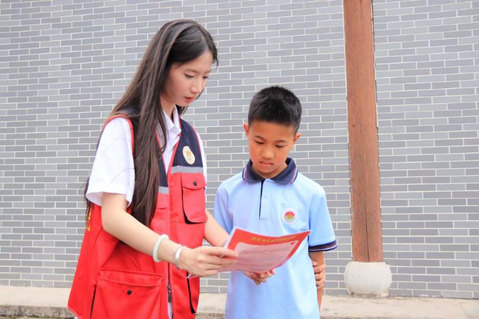 圖為服務隊成員向當?shù)鼐用穹职l(fā)紅色宣傳單并介紹
